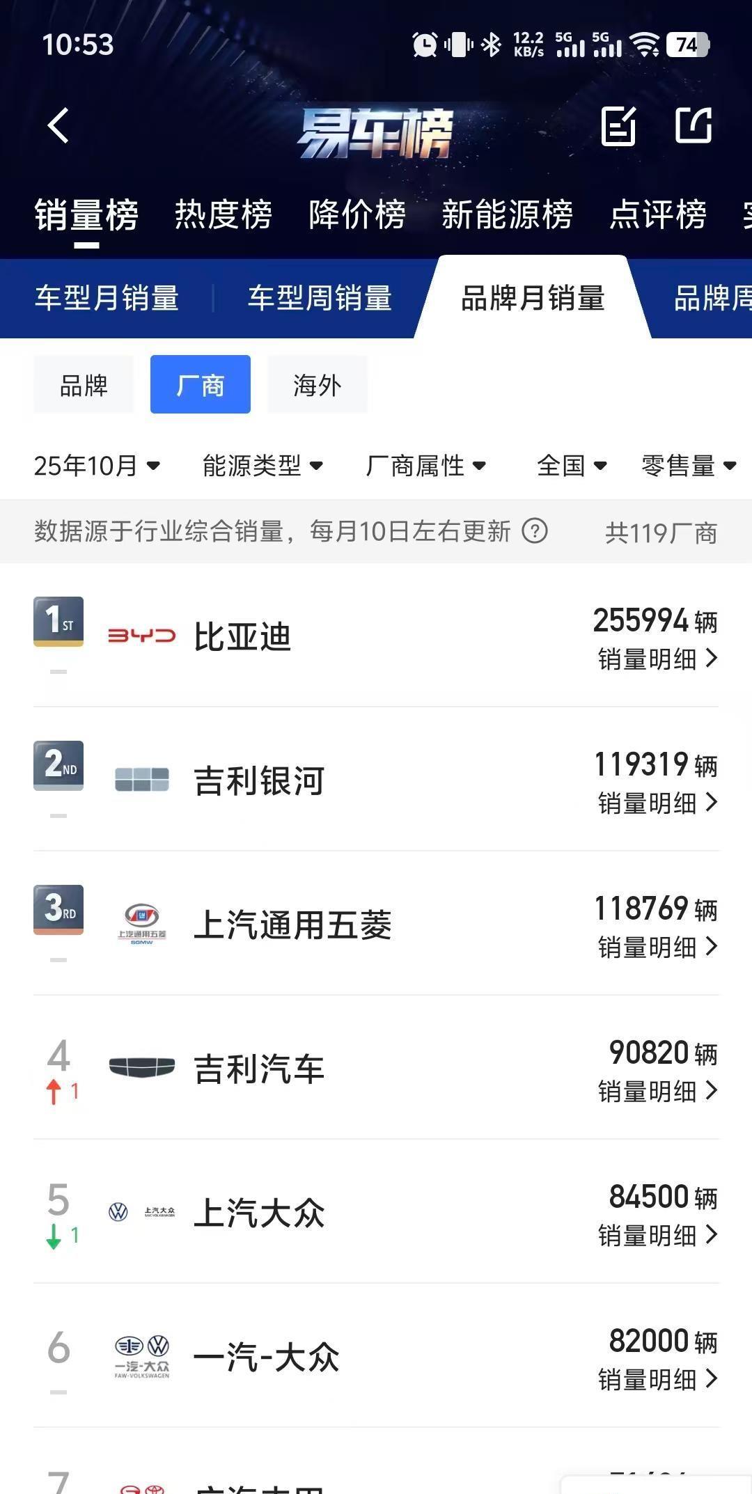 以下是车企的零售销量统计,看出差别了吗?比亚迪10月份的零售销量是25.59万辆,而吉利银河和吉利汽车加起来,零售销量是20.93万辆,双方的差距,只有4.5万左右了。这也让国产一哥的宝座,再添悬念,如果说这几年唯一可以撼动比亚迪的销量冠军地位的,可能只有吉利了。