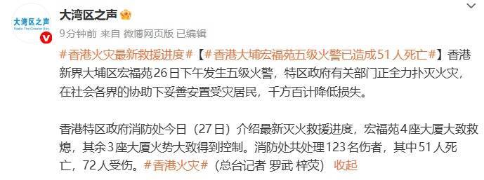 另据@大湾区之声 稍早消息,香港特区政府消防处今日(27日)介绍最新灭火救援进度,宏福苑4座大厦大致救熄,其余3座大厦火势大致得到控制。消防处共处理123名伤者,其中51人死亡,72人受伤。