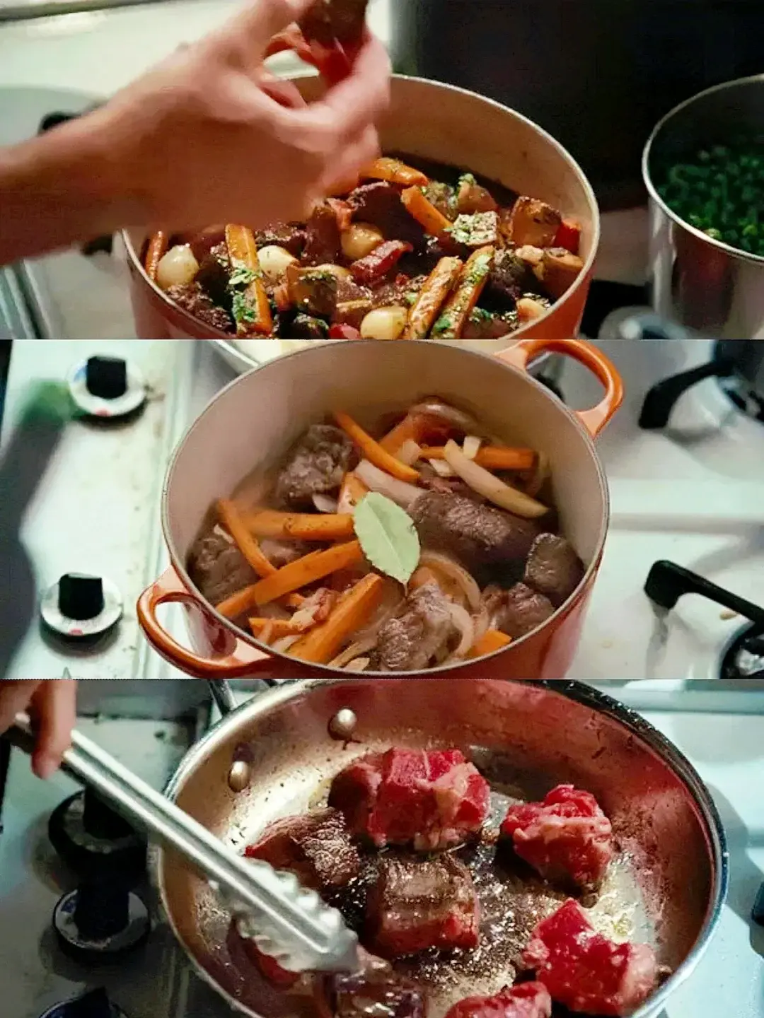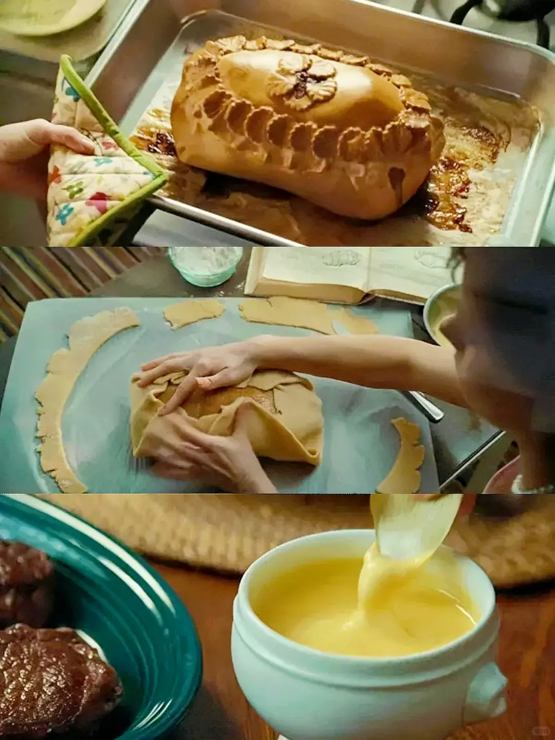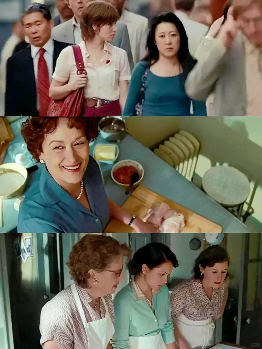 茱莉亚刚学厨艺时,为了在所有人中拔得头筹,回家切了满满的洋葱练习;朱莉做菜的时候,遇见各种困难,各种难事儿,连丈夫都差点拜拜,情绪濒临倒下,最后她调整了自己,坚持了下来,得到了救赎。